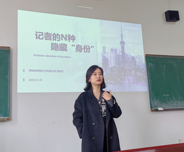 1118日下午,新闻传播实务前沿第十期讲座于逸夫楼408教室如期举行。《湖南日报》教科卫频道资深记者周阳乐应邀带来题为“解锁记者的N种隐藏‘身份’”的专题分享。讲座由唐永亮老师主持,2023级新闻学专业学生参加。