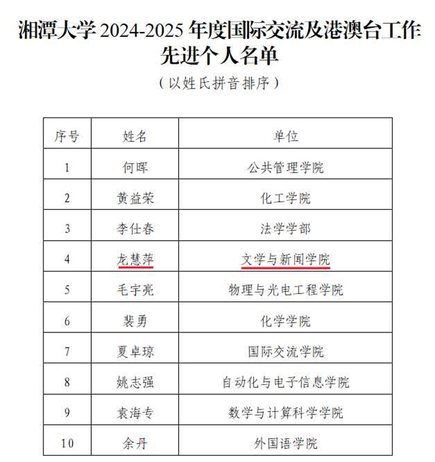 1月9日,学校发布《关于表彰2024-2025年度国际交流及港澳台工作先进个人的决定》,我院龙慧萍副教授获评先进个人。