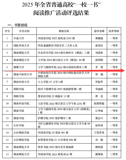 近日,2025年湖南省教育厅“一校一书——经典、精读、经世”阅读推广成果评选结果正式揭晓。我院2023级汉语国际教育2班(指导老师:李倩)凭借周密的活动策划、丰富的阅读实践及突出的推广成效,成功斩获“书香班级”一等奖。同时,肖潇、朱红梅、贺雅琴等多名同学在单项赛事中崭露头角,揽获多项个人荣誉,全方位展现了我院学风建设的扎实根基与创新活力。